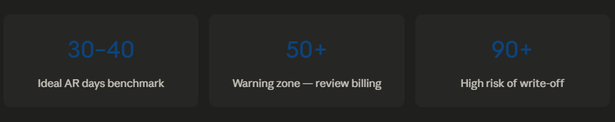 AR days short for Accounts Receivable Days measure how long it takes your practice to collect payment after a service is delivered. In simple terms: from the moment you see a patient to the moment you actually receive the money, how many days does it take?