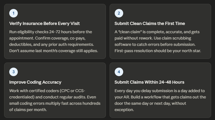 Here’s the practical part. These aren’t vague suggestions — these are the actual steps that high-performing practices use to keep their AR days low and their cash flow healthy.